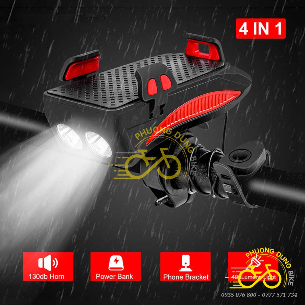 Đèn 2 bóng kèm còi, kiêm giá đỡ, sạc điện thoại xe đạp 2000mAh - 4000mAh 4in1