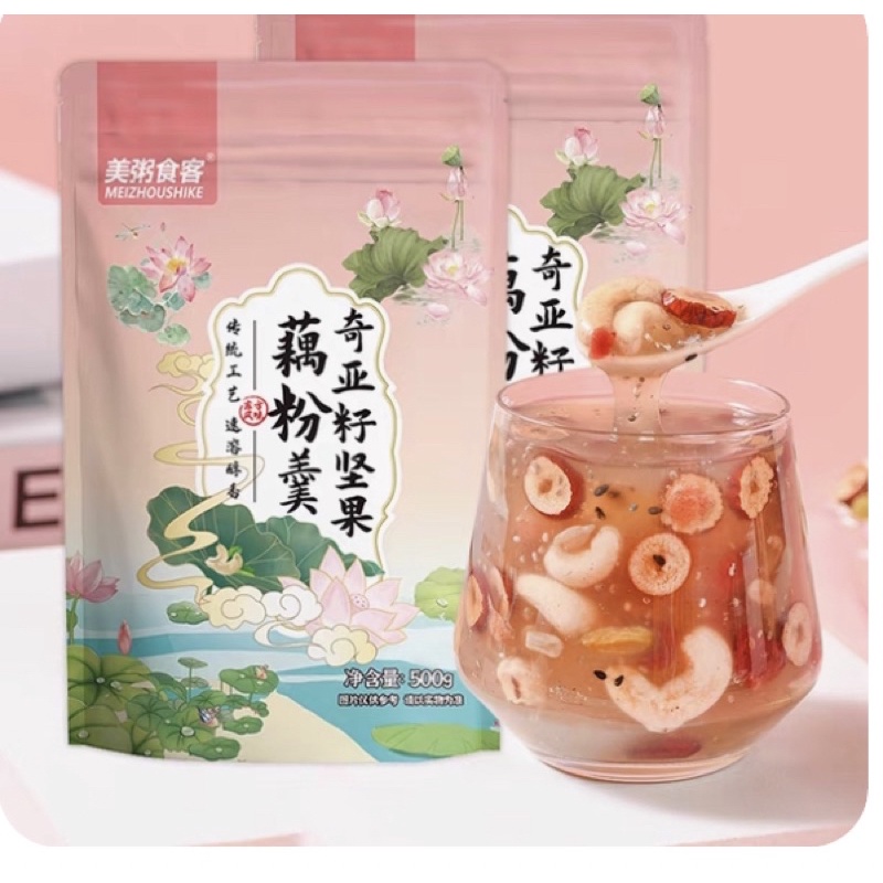 SEN GÓI HỒNG: Bột củ sen nguyên chất, Các loại hạt dinh dưỡng, hoa quả khô, đường phèn, hạt chia, táo đỏ…