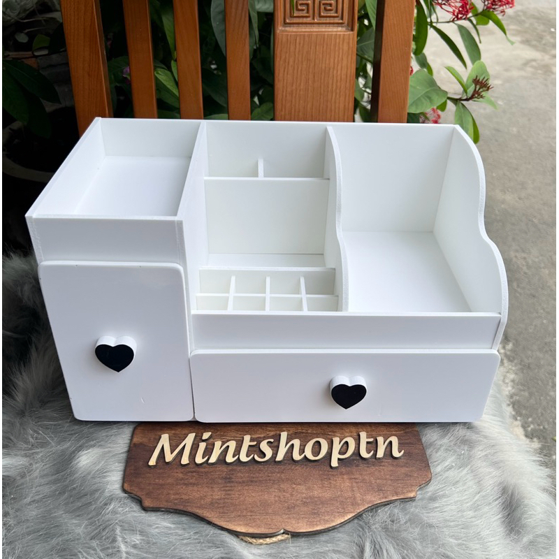 kệ mỹ phẩm max 35cm màu trắng núm tim đen 1 ngăn kéo nhỏ