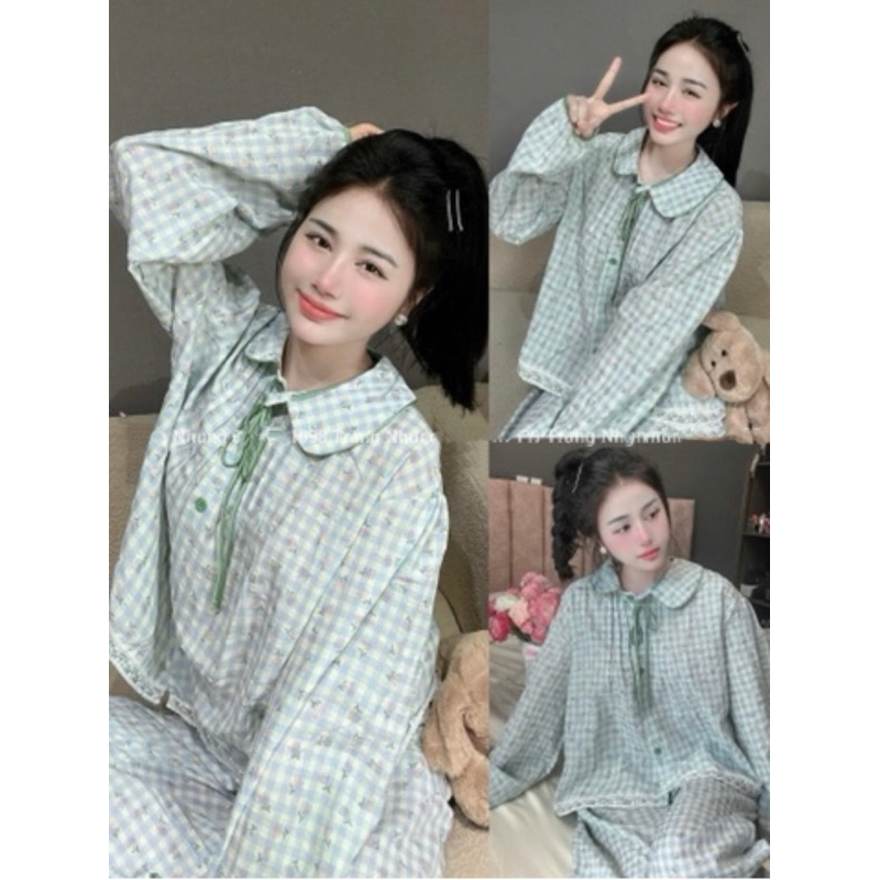 Đồ ngủ nữ pijama bộ mặc nhà dài tay kẻ caro cổ tròn chất đũi lụa siêu xinh