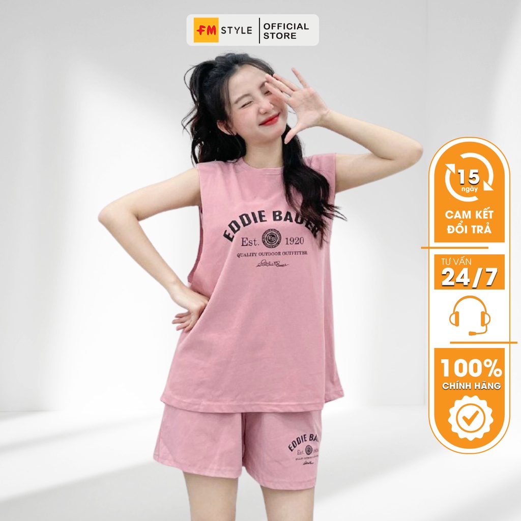 Đồ bộ nữ tanktop FM Style quần đùi ống rộng kèm áo thun sát nách cổ tròn in hình phong cách thể thao Hàn Quốc 207160098