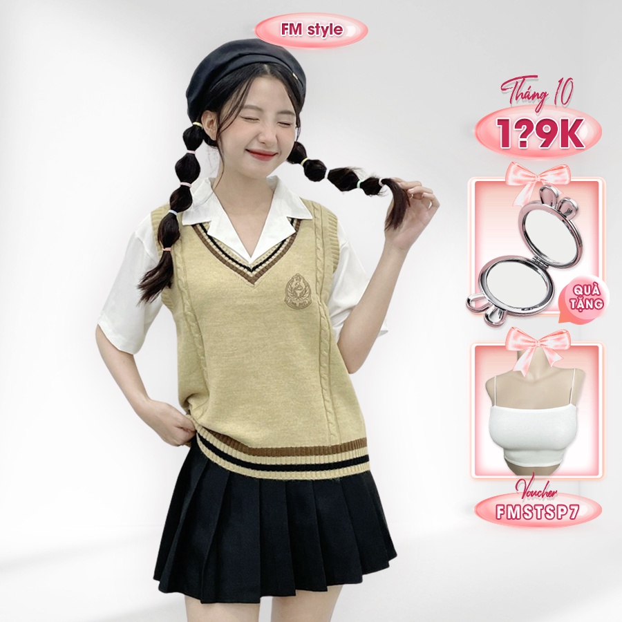 Áo len nữ kiểu FM Style cổ tim viền huy hiệu chất len mềm mịn phong cách thời trang học sinh Hàn Quốc 208150027