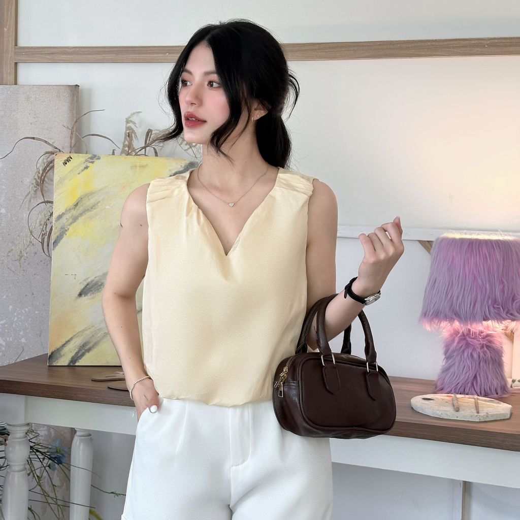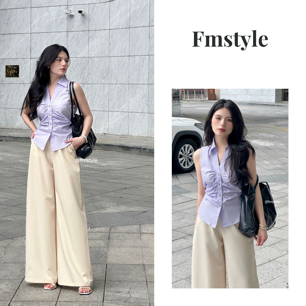 Áo sơ mi kiểu FMSTYLE cổ bẻ chữ V nhún eo sát nách kiểu dáng thanh lịch tone màu basic Freesize