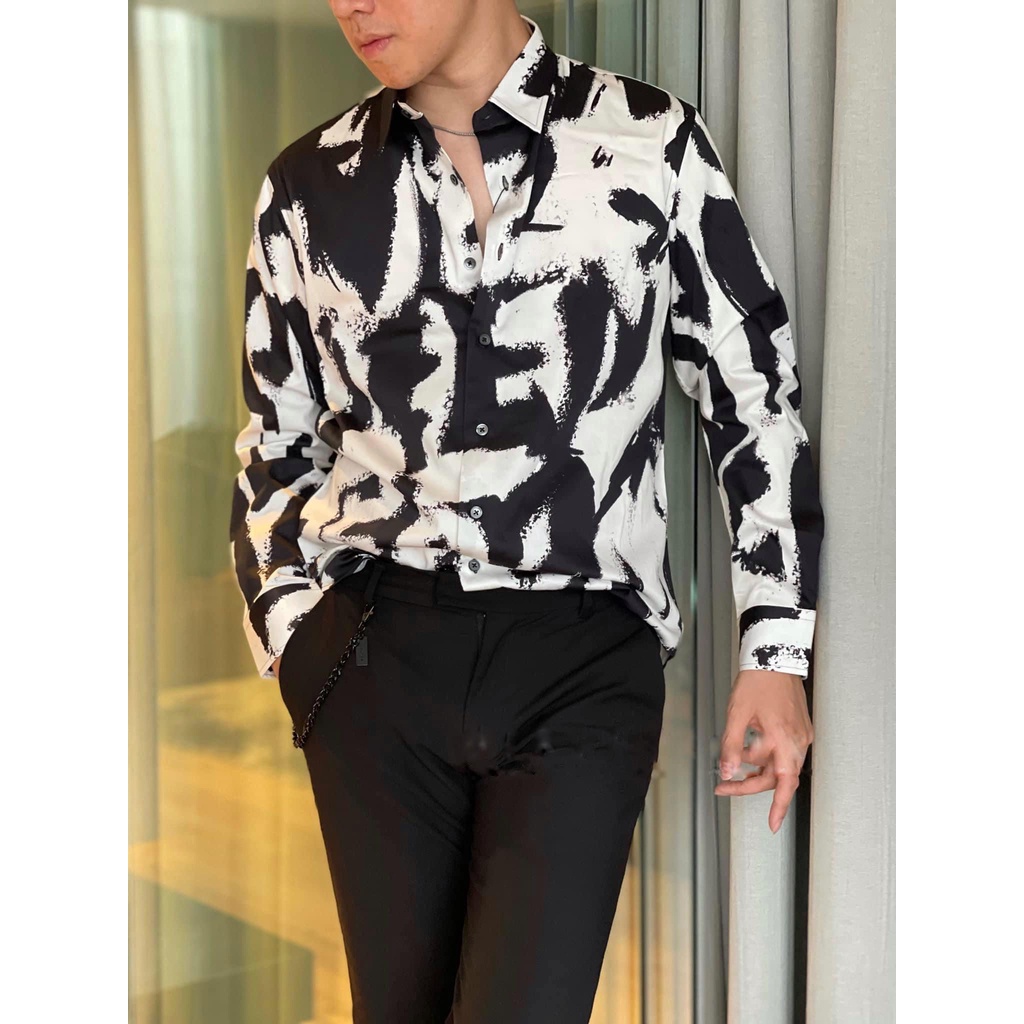 Áo sơ mi nam dài tay phối loang đen trắng vải lụa