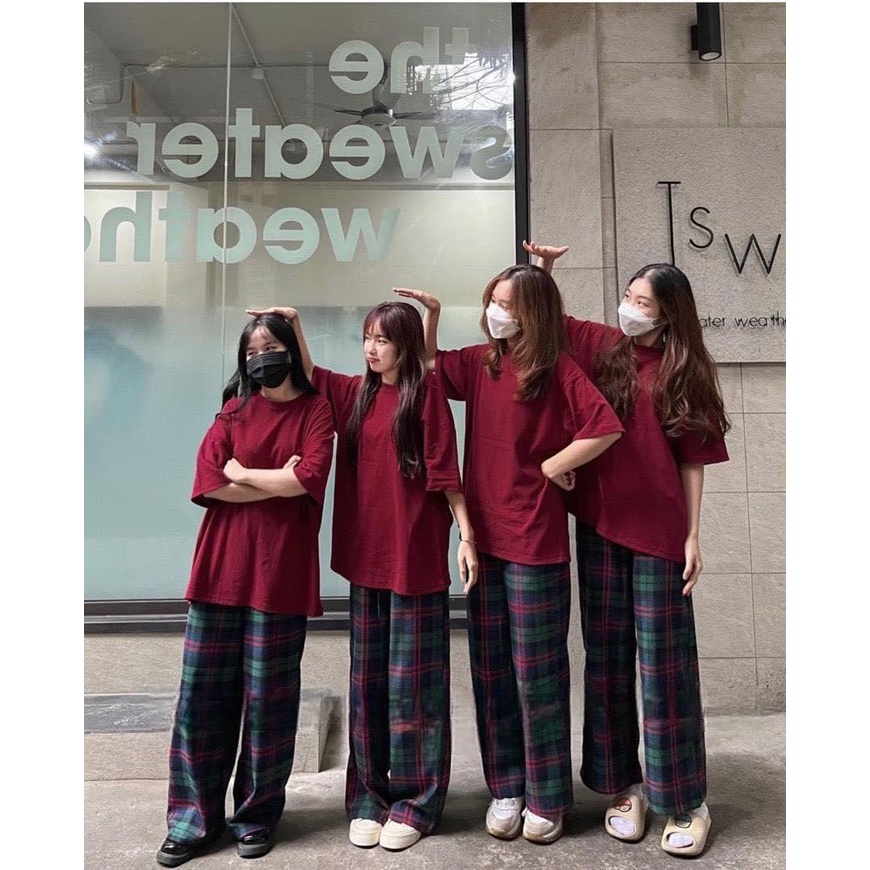 Đồ bộ nữ FM Style diện Noel áo thun đỏ mix quần caro suông cạp chun ống rộng fre