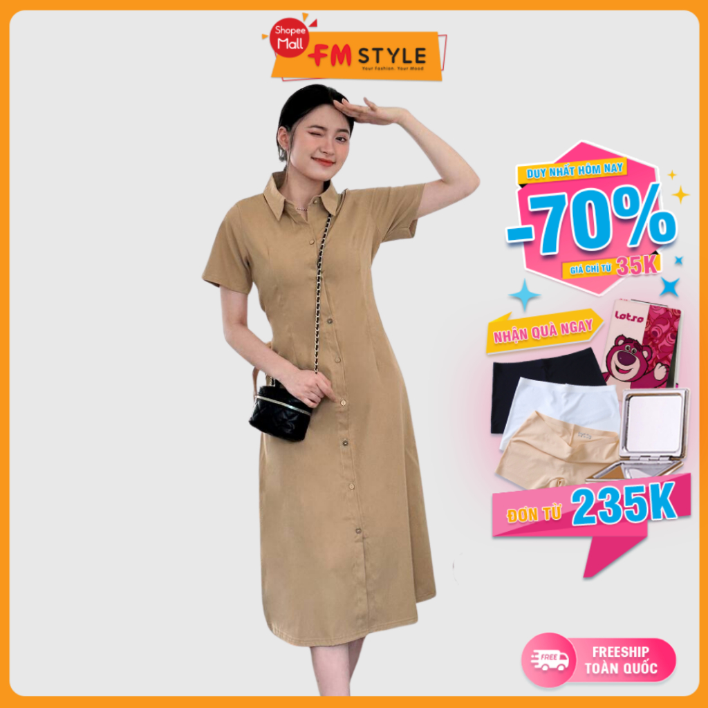 Váy sơ mi nữ FMSTYLE tay ngắn dáng dài thiết kế cổ bẻ nút gài chiết eo lưng thun cổ sơ mi thời trang mùa hè 23031418