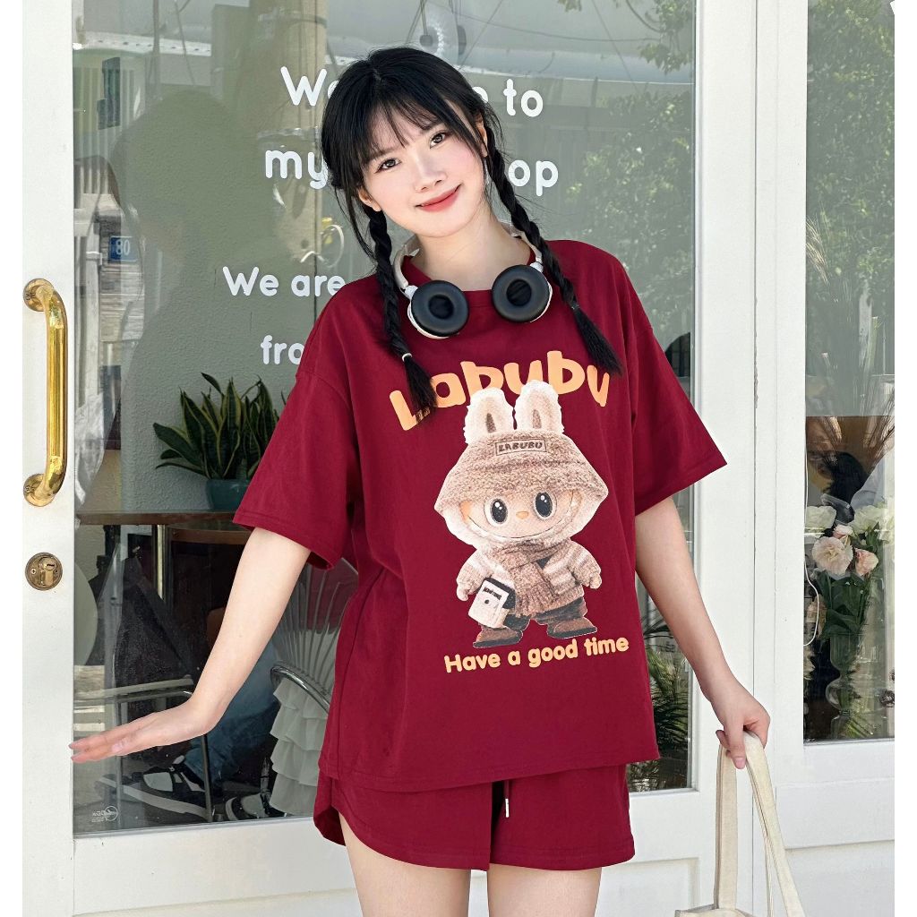 Đồ bộ ngắn nữ FMSTYLE cổ tròn in gấu Labubu vải cotton mềm lưng thun form rộng r