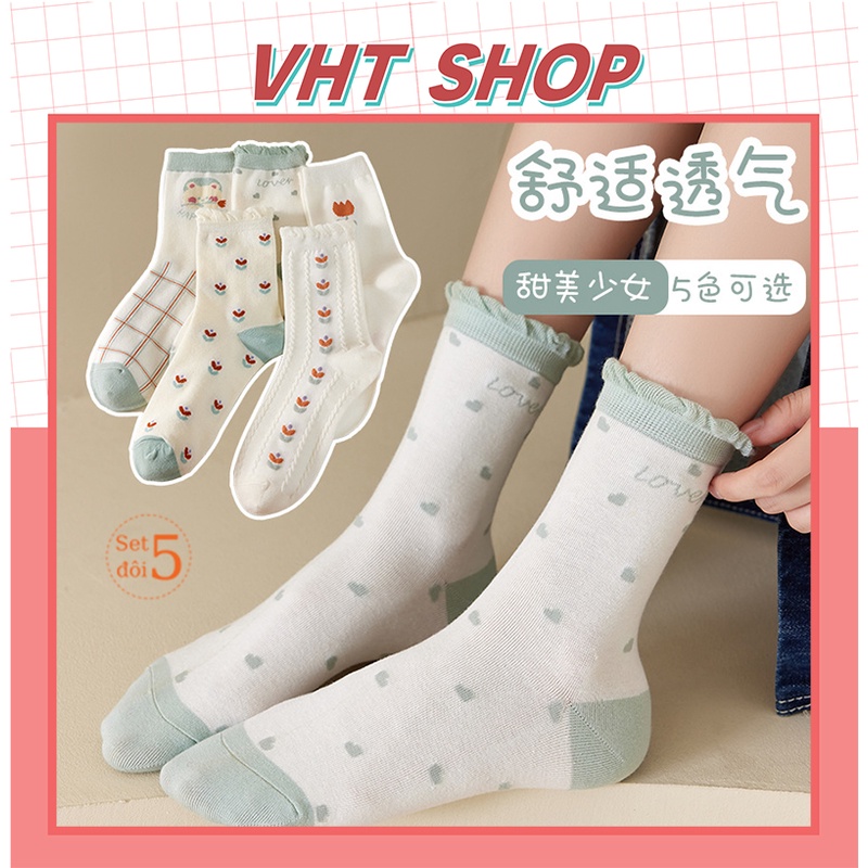 Tất nữ cổ ngắn, set 5 đôi vớ tất nữ vải cotton co giãn họa tiết xinh xắn thời trang TC160Q - VHT SHOP