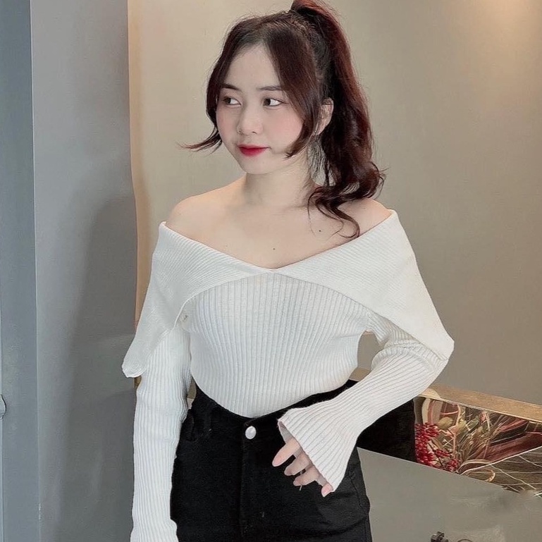 Áo len trễ vai tay dài FM Style len gân co giãn mềm mịn thiết kế cổ tà trễ vai t