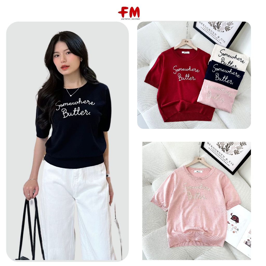 Áo dệt kim tay ngắn nữ FMSTYLE chất len mềm mịn cao cấp thêu chữ somewhere butter tone màu siêu tôn da Freesize 24090259