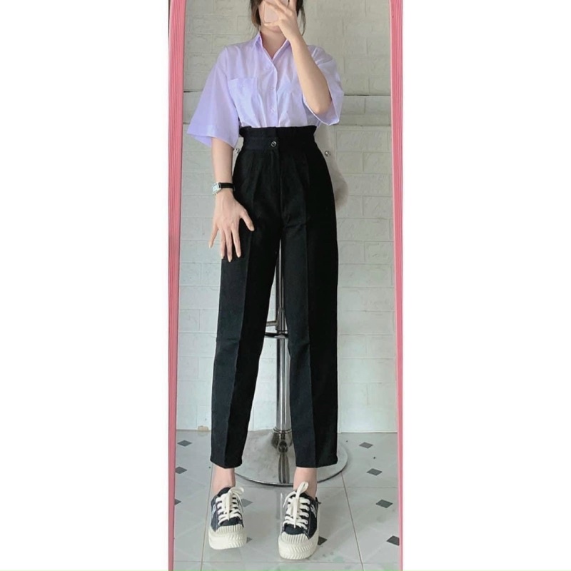 Quần tây baggy đi học nữ cạp có đai lưng cao màu đen dáng dài - Quần vải công sở